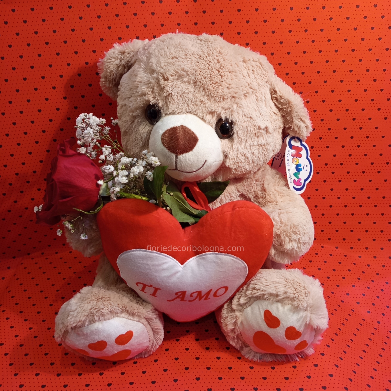 Orsetto peluche h. 35 cm circa,con cuore, rosa rossa e nebbiolina.